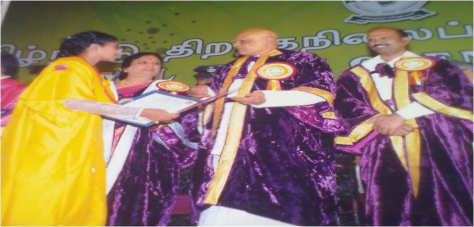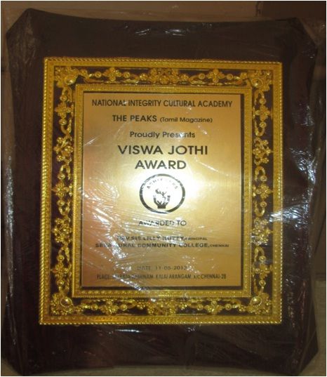 Gold Medal has been awarded by the TNOU to Ms.MOHANALAKSHMI of our first batch student for her out standing performance in her DCAS university exam. Two of our students Ms. PRIYA and Ms. ELEKIYA, in the same batch are also won Rank. All the first three ranks won by our college out of 128 colleges under TNOU in the very first batch itself which is full of pride to say. In the second TNOU convocation also our DCAS student Ms. HEPSIBA won Gold Medal (First Rank) Ms. MARTINA received second rank which proves our education quality and even the drop outs can become outstanding. Our College Principal received a “VISHWA JOTHI AWARD” appreciating her service to the poorest of the poor from National Integrity Cultural Academy